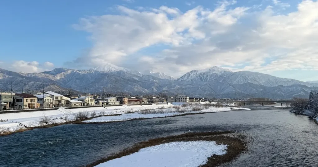 雪景色に包まれた魚沼市の山々や街並みは、冬ならではの静けさと美しさが魅力。